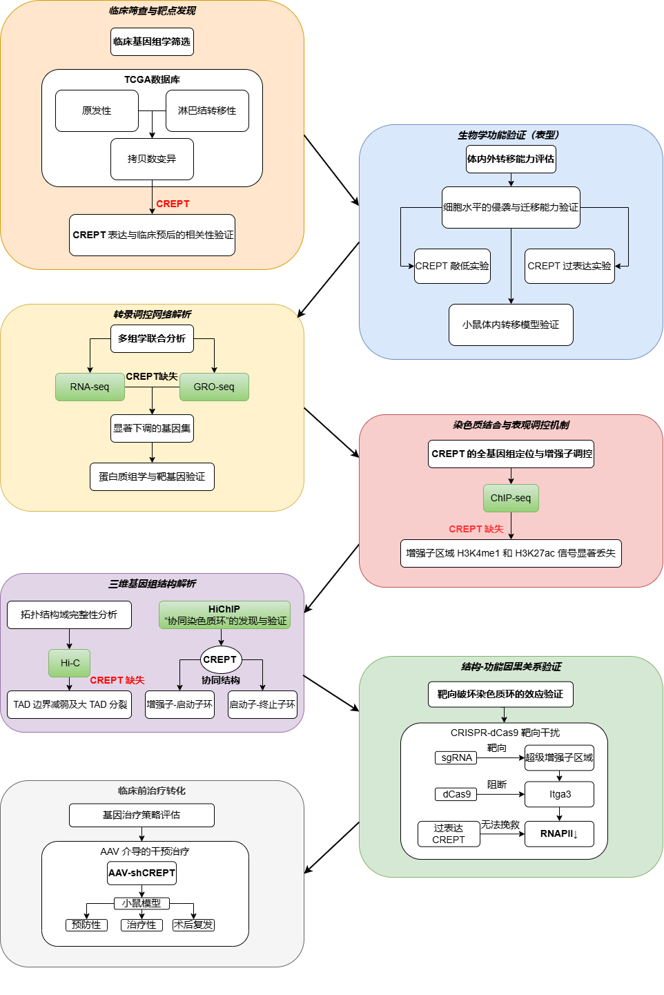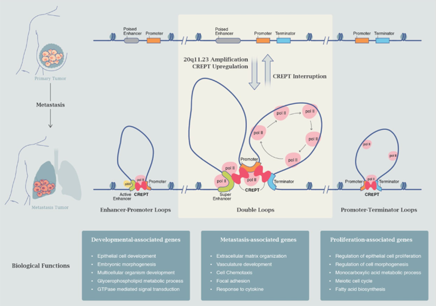 2025年6月10日,清華大學常智傑、重慶金鳳實驗室李俊和清華大學王銀銀共同通訊在《Molecular Cancer》在線發表題為“CREPT is required for the metastasis of triple-negative breast cancer through a co-operational-chromatin loop-based gene regulation”的研究論文。研究通過多組學和三維基因組學手段發現,CREPT在轉移性TNBC中發生拷貝數擴增並高表達,是推動TNBC轉移的關鍵因子。機製上,CREPT並非簡單作為轉錄因子,而是通過介導一種由“增強子–啟動子環”和“啟動子–終止子環”協同構成的染色質高級結構,高效驅動轉移相關基因的持續轉錄。破壞這一結構,無論在細胞水平還是多種小鼠模型中,均可顯著抑製TNBC轉移,提示CREPT及其介導的染色質結構具有潛在治療價值。