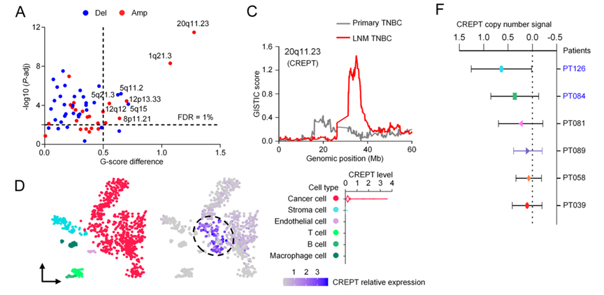 圖1. A)基於TCGA數據比較原發TNBC與LNM-TNBC的SCNV圖譜,紅點代表擴增區域,20q11.23顯示最強正向選擇信號,提示該區域在轉移過程中被選擇性擴增;C)GISTIC 分析顯示CREPT在LNM-TNBC中的拷貝數顯著高於原發腫瘤,直接證明CREPT的基因擴增事件與轉移狀態密切相關;D–F)單細胞RNA-seq結果顯示CREPT高表達細胞集中分布於具有高轉移潛能的患者樣本中,並伴隨明顯的染色體拷貝數擴增特征,提示CREPT高表達並非普遍現象,而是轉移相關細胞群的特征