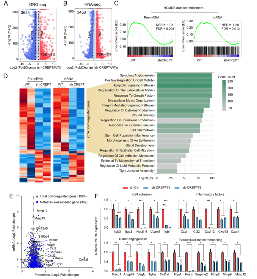 為解析CREPT驅動轉移的分子基礎,研究結合GRO-seq、RNA-seq與定量蛋白質組學,對CREPT調控的轉錄網絡進行了多層次解析。CREPT缺失導致數千個基因在新生RNA、成熟 mRNA 及蛋白水平同步下調,其中高度富集於細胞黏附、炎症因子、血管生成和ECM重塑等轉移核心通路。這一結果表明CREPT並非調控單一轉移基因,而是作為上遊樞紐,係統性維持轉移相關轉錄程序。