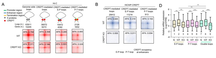 圖6.A)全基因組層麵展示CREPT介導的E–P與P–T環數量,並通過APA分析顯示其在CREPT缺失後顯著減弱;B)CREPT HiChIP實驗直接驗證其物理參與環結構形成;D)帶有CREPT介導環的基因表達顯著高於無環基因,且在CREPT缺失後明顯下調。