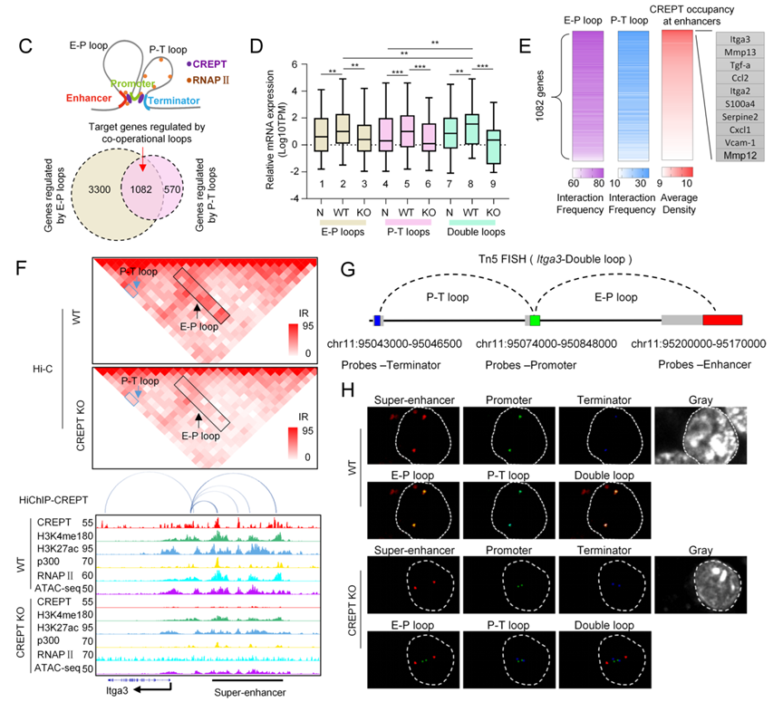圖7.C)示意協同環由E–P與P–T環共同構成,並統計其調控基因數量;E)根據CREPT占據密度排序,協同環富集於經典轉移基因(如Itga3、Mmp13、Ccl2)。F–H)Hi-C、HiChIP與Tn5-FISH直接可視化協同環結構,並顯示CREPT缺失導致三維空間解離。