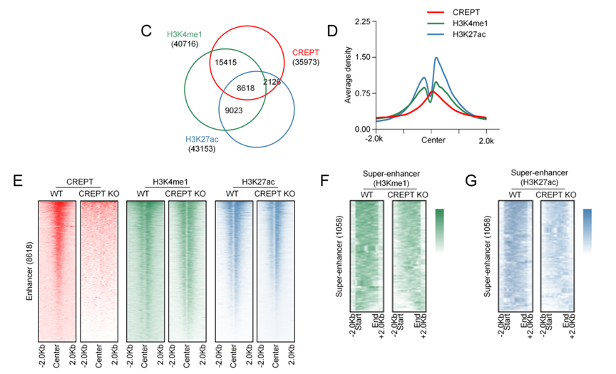 圖4.C–E)ChIP-seq顯示CREPT與H3K4me1、H3K27ac在增強子區域高度共定位,且CREPT缺失顯著削弱這些標誌;F–G)在超級增強子區域,CREPT缺失導致H3K4me1與H3K27ac覆蓋範圍和強度顯著下降,表明其對高階轉錄調控單元尤為關鍵。