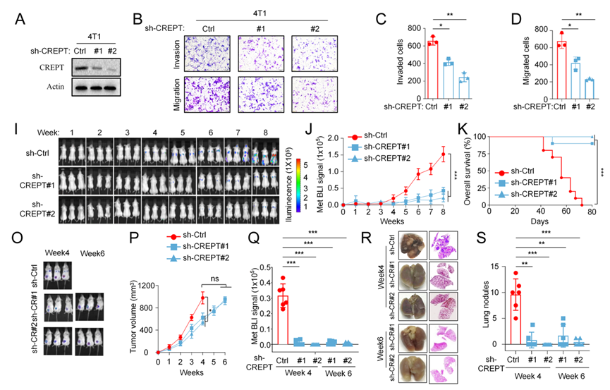 圖2. A–D)在4T1高轉移細胞中敲低CREPT後,Transwell侵襲和遷移實驗顯示細胞跨膜能力顯著下降,表明CREPT對細胞運動性具有直接調控作用;I–K)尾靜脈注射模型結合生物發光成像(BLI)顯示,CREPT缺失顯著減少多器官轉移負荷,並顯著延長無轉移生存期;O–S)原位乳腺脂肪墊模型中,在原發腫瘤大小相當的條件下,CREPT缺失組幾乎不產生肺轉移,證明其對轉移的調控獨立於腫瘤增殖。