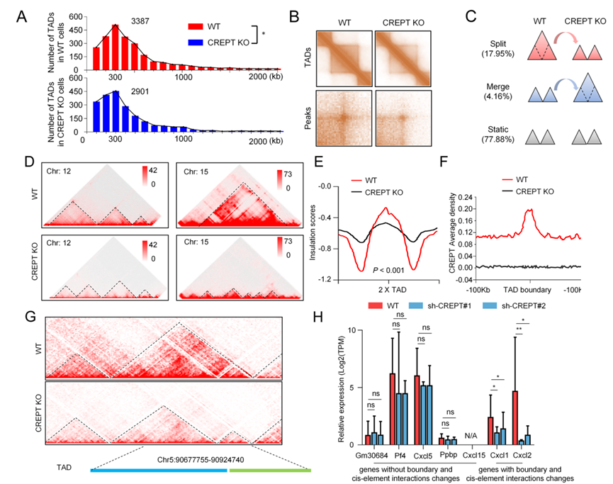 在三維基因組層麵,Hi-C分析顯示CREPT缺失並不顯著改變A/B compartment,但會引發大規模TAD分裂和邊界減弱。這些結構變化直接影響TAD內順式調控元件與基因的有效接觸,從而導致部分轉移基因轉錄下調。