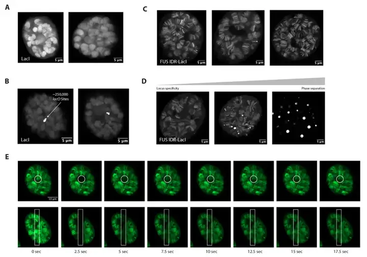 在果蠅唾液腺細胞中,LacI單獨表達時在多線染色體上呈均勻非特異性分布;而將人類FUS IDR融合至LacI後,嵌合體在果蠅基因組(不含lacO序列)的常染色質區域形成離散的染色質條帶,表明IDR可賦予非特異性DBD明確的基因座特異性。FRAP實驗顯示條帶內熒光在數秒內迅速恢複,說明這種富集來自瞬時相互作用而非穩定結合。在高表達水平下,FUS IDR-LacI形成球形液滴,條帶信號隨之消失,提示相分離與基因座特異性結合相互排斥