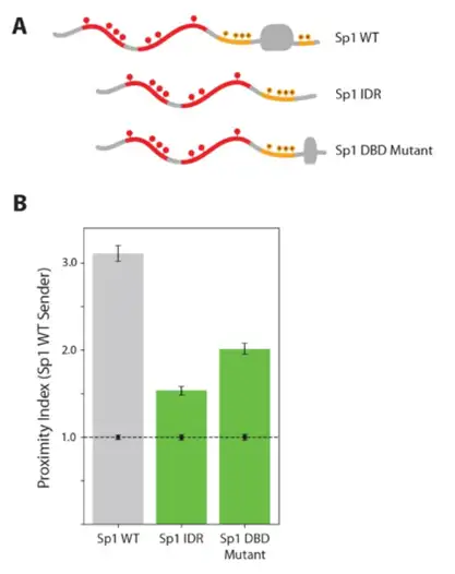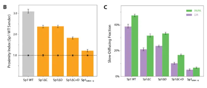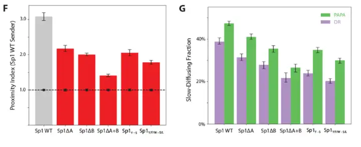 刪除N端IDR中富含穀氨酰胺和芳香族殘基的A區或B區,均導致染色質結合下降和與野生型Sp1相互作用減弱。將IDR外所有酪氨酸替換為絲氨酸或所有芳香族殘基替換為非芳香族殘基,均顯著降低染色質結合和同型相互作用,且後者效果更強,表明同型相互作用強度與芳香族殘基總量正相關