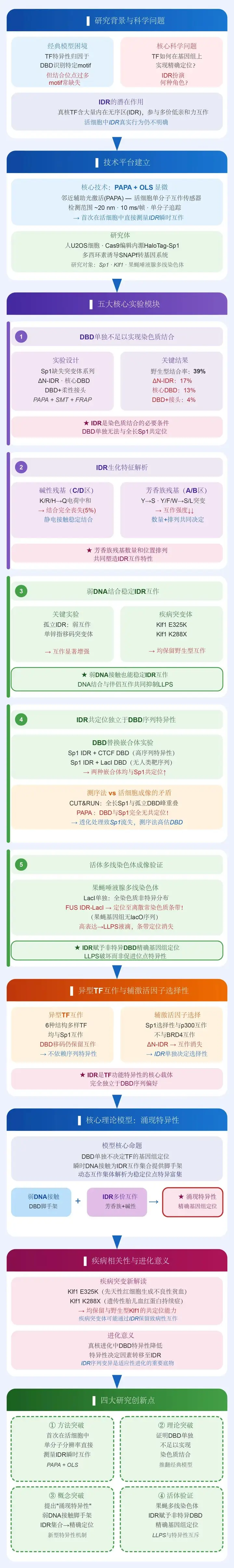 研究者基於實驗結果提出湧現特異性框架:真核TF的基因組定位並非由DBD或IDR單獨決定,而是在完整核環境中通過多種動態、低親和力接觸集體協同產生,這與依賴折疊結構域穩定配對的經典細菌調控模型存在本質區別。這一框架可解釋DBD序列偏好相同的TF占據不同基因組位點、以及TF結合於缺乏可識別基序位點等長期悖論,並提示IDR在真核進化中的擴張與多樣化可能正是特異性決定因素從順式調控序列向反式無序區域轉移的結果。在疾病層麵,EWS-FLI1等TF融合癌蛋白及Sp1、Klf1等顯性DBDtubianti,kenengtongguogaibianwuxuxianghuzuoyongwangluoerfeidanchungaibianxulieteyixingfahuizhibingzuoyong,zheyizhouxianzaijiwangyanjiuzhongchangqibeidigu。yanjiuzhetongshitancheng,PAPA與SMT無法解析基因組坐標,IDR介導的TF定位是否直接驅動轉錄激活尚未證明,約1600種人類TF之間的無序相互作用網絡仍有待係統探索。
