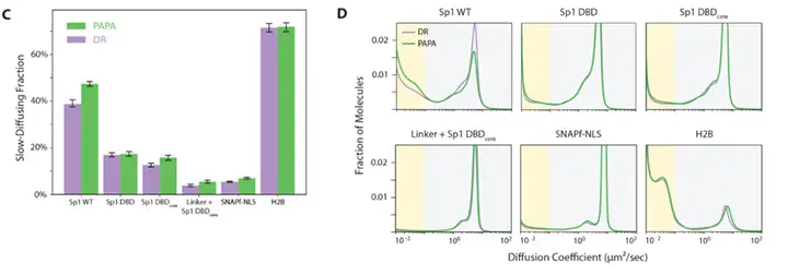 PAPA檢測顯示,DBD變體與全長Sp1的鄰近指數與陰性對照H2B無法區分,表明DBD單獨存在時既不能穩定結合染色質,也不能與全長Sp1共定位。