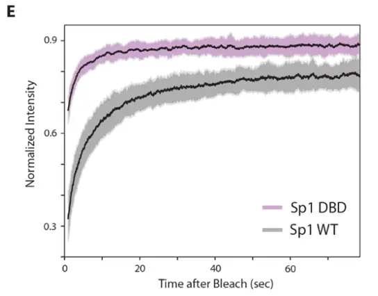 去除N端IDR的Sp1變體染色質結合比例從野生型的39%驟降至17%,而僅保留DBD的變體進一步降至13%。即便在DBD與SNAPf之間插入與N端IDR等長的柔性親水接頭,染色質結合仍幾乎完全喪失。FRAP實驗獨立驗證了這一結論,DBD單獨存在時漂白深度明顯更淺、恢複更快。