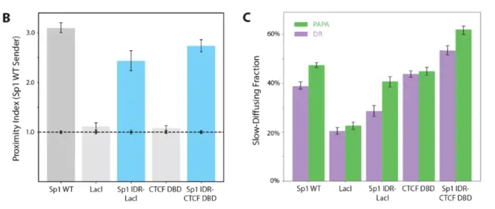 將Sp1 DBD替換為CTCF DBD或LacI(後者在人類細胞中無同源序列)構建的嵌合體,均比孤立IDR或孤立DBD表現出更強的與野生型Sp1的共定位,且PAPA重激活分子富集於染色質結合狀態。這表明結構化DNA結合可穩定無序相互作用,且該效應不嚴格依賴於DBD的序列偏好