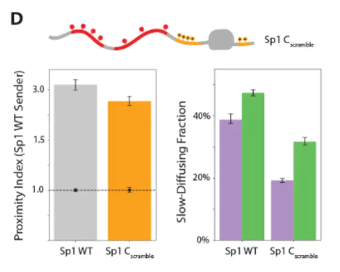 而且打亂A+B區序列在保持殘基組成不變的情況下反而增強了與野生型Sp1的相互作用,說明IDR的相互作用特性對序列重排具有較強耐受性,甚至可因重排而增強。
