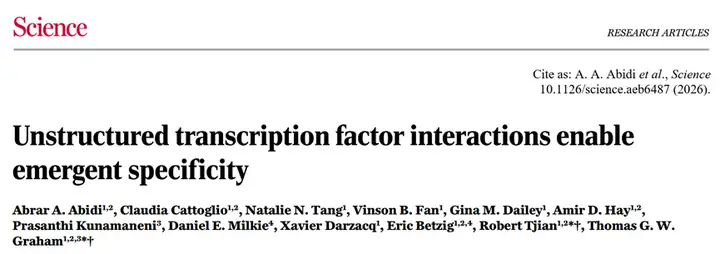 2026年3月19日,加州大學伯克利分校分子與細胞生物學係的Robert Tjian與Thomas G. W. Graham團隊聯合霍華德·休斯醫學研究所於《Science》發表了題為Unstructured transcription factor interactions enable emergent specificity的研究。研究者采用鄰近輔助光激活技術(PAPA)作為單分子蛋白質相互作用傳感器,在活細胞中係統研究了IDR對TF相互作用及染色質結合的影響。核心發現包括:Sp1的DBD單獨存在時與染色質結合能力極弱,且無法與全長Sp1共定位;而將IDR與各類無關DBD融合後,可顯著增強其與Sp1的相互作用;在果蠅唾液腺活體成像中,將IDR融合至非特異性DBD可使其獲得明確的基因座特異性定位。研究者據此提出,TF特異性並非由DBD單獨決定,而是在染色質上通過多種無序相互作用的集體協同湧現而來。